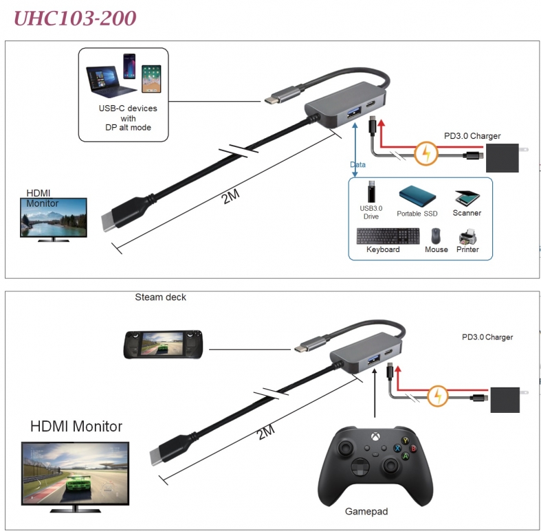 - 【PCT】USB-C 3 in 1 to HDMI 2M Male Cable/ USB3.0 / USB PD(UHC103-200)