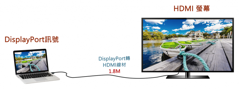 只需透過一條線,即可將DisplayPort介面連接至HDMI顯示器,長度可達1.8公尺。