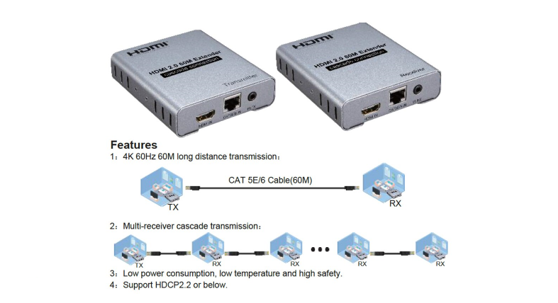 | 功能 | 4K60Hz 60M HDMI Extender over Cat5e6 |