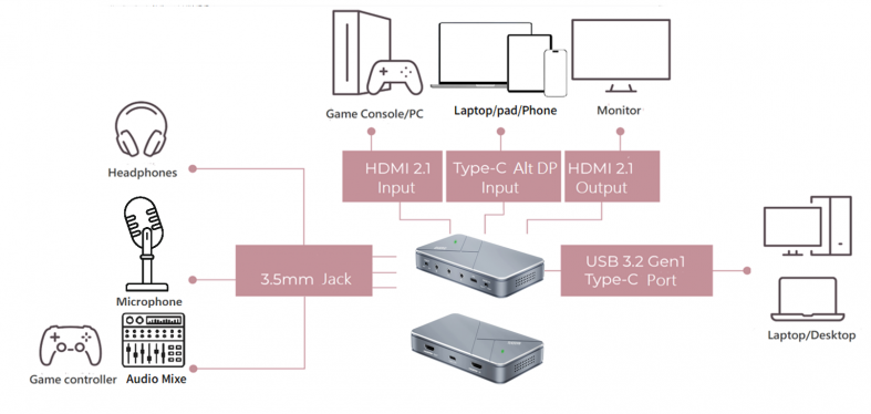 三個3.5mm JACK 輸入介面設計:HDMI 擷取卡內建耳機和揚聲器音訊插孔、麥克風插孔和混音器線路輸入插孔,可滿足直播、線上會議、遊戲錄製等多種使用場景。