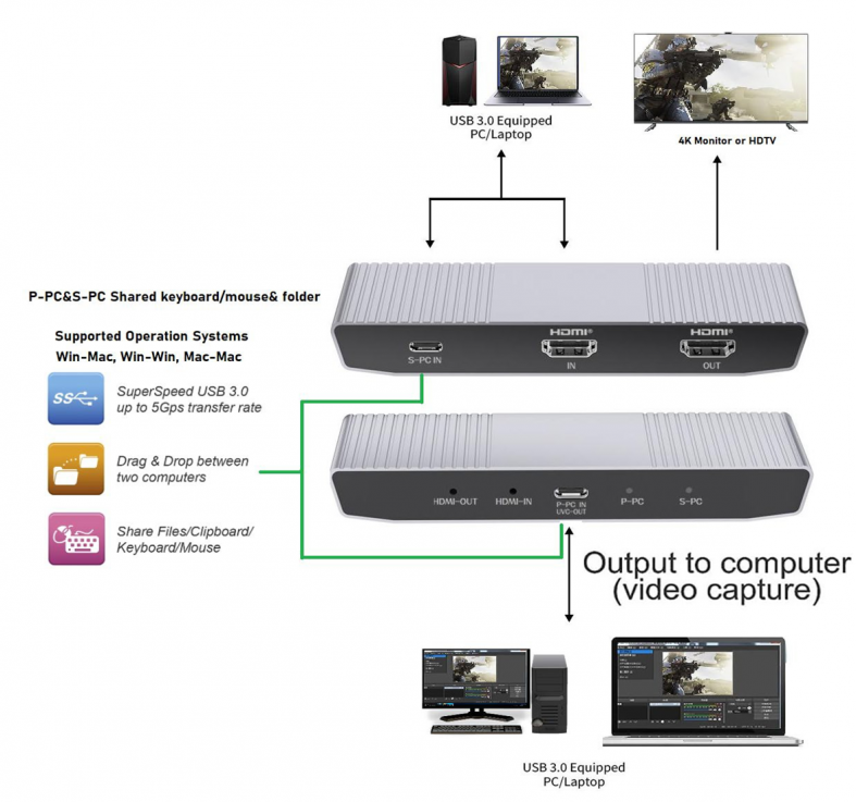 該裝置採用 UAC(USB 音訊類別)和 UVC(USB 視訊類)標準進行 USB 擷取,因此支援大多數常見的視訊擷取、聊天或直播軟體,包括適用於 Windows PC、macOS 免費的 OBS(Open Broadcaster Software) Potplayer、OBS、XSplit ...等直播軟體。本裝置直接由 USB 3.1 Gen1 連接埠供電,無需外接電源。設備的可用功能和可控性取決於所使用的採集軟體。
