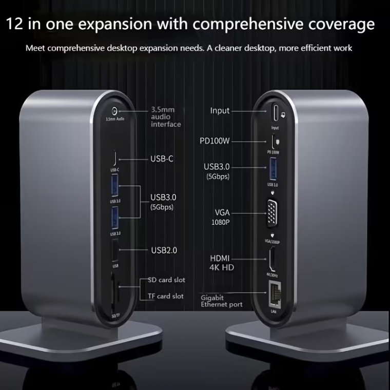 PK120ST can unlock your laptop’s full potential and stay connected like never before! The Innodude USB-C Hub Docking Station features an impressive array of 12 ports, including a powerful PD100W charging port, HDMI and VGA outputs for stunning visuals, 4 USB-A ports for all your peripherals, a 100M Ethernet port for reliable internet access, and SD/TF card reader slots for easy file transfers. Effortlessly connect all sour devices and enjoy seamless multitasking.